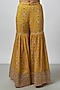 Featuring a yellow peplum kurta in cotton silk base with floral jaal embroidery. It is paired with sharara pants and a chiffon dupatta. Accentuate it with statement jewellery and heels for a festive look.