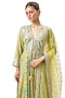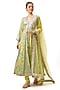 Featuring a yellow anarkali in cotton silk base with a deep v-neckline and motif hand embroidery. It is paired with lycra churidar pants and a net sequin embellished dupatta. Accentuate it with statement jewellery and embellished heels for a festive occasion or haldi ceremony.