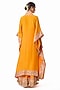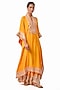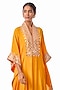 Featuring a yellow kaftan in crepe base with flared sleeves and embroidery. It is paired with raw silk crushed sharara pants. Accentuate it with dangler earrings and heels for a festive occasion or haldi ceremony.
