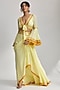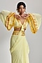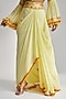 Featuring a yellow draped skirt in crepe base with tassels and mirror work, including hand and machine embroidery. It is paired with a georgette blouse. Style this skirt set with dangler earrings and heels for any haldi or cocktail ceremony.