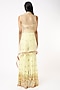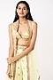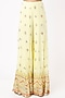 Featuring a lime yellow pant in georgette base with sequins and ikat motifs embroidery. It is paired with a matching blouse, and an organza cape.