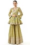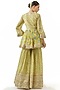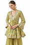 Featuring a yellow peplum kurta in georgette base with a v-neckline, floral print and embroidery. It is paired with cotton silk sharara pants and a net tikki dupatta. Accentuate with statement jewellery and heels for a sangeet or cocktail ceremony.