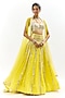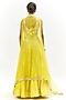 Featuring a yellow cape in organza base with embroidery. It is paired with a tussar embroidered blouse and a lehenga. Accentuate the designer kurta set with statement jewellery and heels for festive occasions or haldi ceremonies.