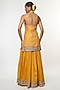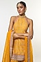 Featuring a yellow halter-neck kurta in tussar base with embroidery in a strappy pattern. It is paired with organza sharara pants and a banarasi organza dupatta. Style this set with chandbali earrings, juttis and a clutch for weddings, festive celebrations or traditional family gatherings.