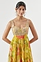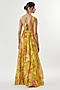 Featuring a yellow sleeveless gown in organza base with floral print and embroidery. Style it with metallic heels and statement earrings for an effortlessly glam look.