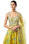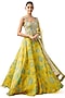 Featuring a yellow lehenga in organza base with sequins, thread and beads embroidery. It is paired with a cotton silk blouse and a net tikki dupatta. Accentuate with statement jewellery and heels for a haldi, sangeet or cocktail ceremony.