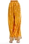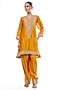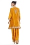 Featuring a yellow asymmetric kurta in tussar base with embroidery. It is paired with salwar pants having motifs and embroidery. Accentuate it with statement chandbali earrings and an embellished juttis for a refined ensemble, ideal for haldi ceremonies or festive occasions.