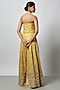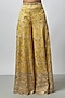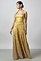 Featuring a yellow corset in tussar base with mirror work and embroidery. It is paired with embroidered wide-legged pants. Accentuate it with statement jewellery and heels for any festive occasion or haldi ceremony.
