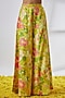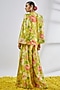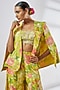 Gopi Vaid presents a yellow and pink cape blazer in tussar base with floral print. It is paired with panel pants and a chiffon embroidered crop top. Accentuate it with kundan polki earrings and block heels for haldi ceremonies.
