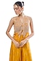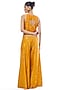 Featuring a yellow blouse in tussar base with embroidery and a V-neckline. It is paired with motif pants. Accentuate it with statement chandbali earrings and an embellished heels for a refined ensemble, ideal for haldi ceremonies.