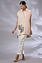 Featuring a beige and salmon asymmetrical shirt in linen base with thread detailing. It is paired with trousers. Style it with dangler earrings and neutral heels, ideal for casual wear.