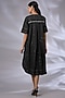 Featuring a black flared tunic in denim base with band collar, crochet hand embroidery, frayed hemline, and edge detailing. Style with minimal jewellery and neutral heels, ideal for casual wear.