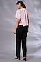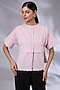 Featuring an ice pink structural crop top in cotton base with front panels, blue stitch detailing, and button back closure. Style with casual pants and neutral heels, ideal for casual wear.