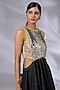 Featuring a lime and blue sculpted dress in denim and mesh base with circular scoop cut-outs. Style with minimal jewellery and neutral heels, ideal for casual wear.