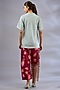 Featuring an olive green t-shirt in satin base with curtain side gathers, satin slime tassels and metal drops. It is paired with denim trousers having metal firefly embroidery. Style with minimal jewellery and sleek heels, perfect for brunches, casual office wear, travel, or evening outings.
