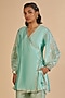 Featuring an aqua tunic in chanderi base. Accentuate it with pants, statement earrings and wedges for festive gatherings or family functions.