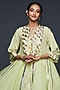 Gulabo By Abu Sandeep features a pista green flared kurta in chanderi and jamdani base with gota applique detail. Accentuate it with pants, statement earrings and heels for a festive occasion or pooja ceremony.