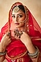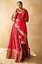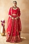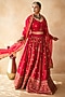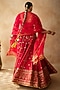 Featuring a red lehenga in chanderi and cambric cotton base with floral motif, sequins, thread and beads embellishments. It is paired with an unstitched blouse fabric and an organza embroidered dupatta. Accentuate it with statement jewellery, a potli bag and embellished heels for a polished ensemble, ideal for a wedding, sangeet nights or engagement ceremony.