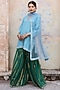 Featuring a sky blue hand crafted kurta in muslin base with taari hand embroidery and lace. It is paired with contrasting green sharara pants and a matching organza dupatta.