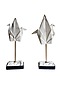 Crafted in polyresin, two swan sculptures perched on metal stands. The origami-fashioned swans are finished in white with grey shading and gold highlights making for a great coffee table or console piece.