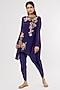 Featuring a dark blue kurta in chiffon crepe and pure silk base with floral motifs, sequins, silk thread, and beads hand embroidery. It is paired with matching overlapped pants.