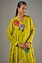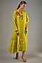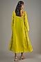 Featuring a green midi dress in fine chanderi base with hand embroidery and a side panel. It is paired with an inner. Accentuate it with dangler earrings and block heels for festive celebrations or family gatherings.
