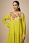 Featuring a green tiered midi dress in fine chanderi base with hand embroidery. It is paired with an inner. Accentuate it with dangler earring and mules for festive gatherings or garden parties.