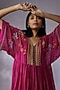 Featuring a pink dress in fine chanderi base with hand embroidery and square sleeves. It is paired with a slip. Accessorise with dangler earrings and flats.