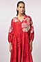 Featuring a red dress in fine chanderi base with gathered sleeves and applique hand embroidery. It is paired with an inner. Accentuate it with statement earrings and coordinated mules or flats for a relaxed sleek look, perfect for family gatherings or daytime outings.