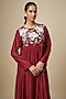 Featuring a red tiered midi dress in fine chanderi base with hand embroidery. It is paired with an inner. Accentuate it with dangler earring and mules for festive gatherings or garden parties.