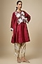 Featuring a red short anarkali in heavy chanderi base with thread hand embroidery. It is paired with embroidered pants and an inner. Accentuate it with kundan polki earring and heels for festive gatherings or pooja ceremony.