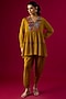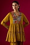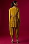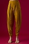 Featuring a yellow peplum in crepe chiffon base with embroidery. It is paired with dhoti pants. Accentuate it with kundan polki earrings and juttis for festive gatherings or haldi ceremony.