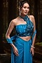 Featuring an azure blue draped skirt in lycra net base. It is paired with a bustier having 3D floral hand embroidery and a dupatta. Accentuate it with statement earrings, a clutch and block heels for cocktail parties.