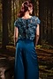 Featuring a cobalt blue jacket in sola silk and organza base with 3D floral motif hand embroidery. It is paired with a bustier and pants. Accentuate it with statement earrings, a clutch and block heels for a evening look.