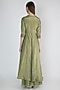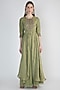 Featuring an olive green high-low front open jacket style kurta in tissue base with zardosi and sequins embroidery. It is paired with matching kalidar pants in foil mul base.