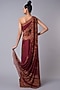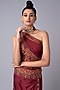 Featuring a Brick - Red one-shoulder corset in raw silk with beaded and sequins embroidery. Teamed with a slim skirt with printed georgette pleats. Lined in butter-crepe.
