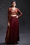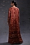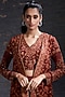 Featuring a brick red printed and embellished floor-length jacket in georgette. It is paired with an embellished raw silk top and plain crepe palazzo.