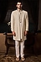 Featuring a beige sherwani in raw silk base with gunmetal beads and resham embroidery. It is paired with a cotton silk embroidered kurta and cotton lycra straight pants. Style it with a stole, heritage brooch and regal safa, perfect for engagement ceremonies or an heirloom look, rooted in tradition and elegance.