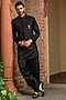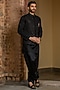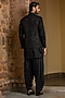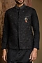 Featuring a black bundi jacket in raw silk base with resham, crystal and bead embroidery. It is paired with a matching viscose silk kurta and salwar pants.