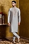 Featuring a grey-green kurta in cotton silk base with single thread kasab embroidery. It is paired with churidar. Elevate the look with minimal accessories and classic mojaris for sangeet ceremonies.