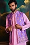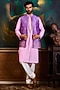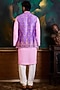 Featuring a lilac bundi jacket in raw silk base with patras and resham embroidery. It is paired with a pink cotton silk kurta and cotton silk churidar. Style it with a heritage brooch and regal safa, perfect for weddings or a sangeet ceremony, rooted in tradition and elegance.