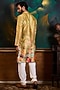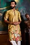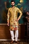 Featuring an olive green kurta in poly dupion base with print. It is paired with beige cotton silk churidar. Elevate the look with minimal accessories and classic mojaris for mehendi ceremonies.