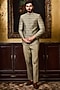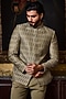 Featuring an olive green jodhpuri jacket in raw silk base with beads, gunmetal sequins and tonal resham work. It is paired with cotton lycra straight pants. Accessorize it with a statement watch, pocket square and loafers for mehendi or reception ceremonies to fuse tradition with urbane charm.