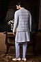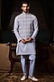 Featuring a powder blue bundi jacket in raw silk base with beads and dabka embroidery. It is paired with a cotton silk kurta and cotton lycra pants. Style it with a stole, heritage brooch and regal safa, perfect for sangeet ceremonies or an heirloom look, rooted in tradition and elegance.