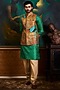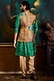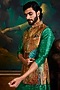 Featuring a rust and emerald green bundi jacket in poly dupion base with print. It is paired with an emerald green kurta and cotton silk churidar. Style it with a heritage brooch and regal safa, perfect for weddings or a mehendi ceremony, rooted in tradition and elegance.