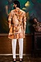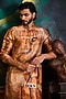 Featuring a rust kurta in poly dupion silk base with print. It is paired with ivory straight cotton lycra pants. Elevate the look with minimal accessories and classic mojaris for sangeet ceremonies.