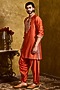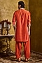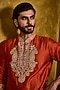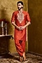 Featuring a rust kurta in tissue chanderi and cotton silk base with beads, dabka, kasab and gold applique embroidery. It is paired with salwar pants. Elevate the look with minimal accessories and classic mojaris for sangeet ceremonies, radiating regal grandeur.