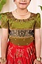 Featuring a red pleated skirt for girls in meenakumari silk base. It is paired with a green top having aari work. Accessorize it with matching hair accessories and sandals for a stylish ensemble, ideal for festive occasion, pooja or wedding ceremonies.