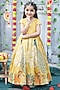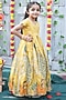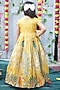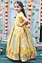 Featuring a shiny yellow gown for girls in soft tissue base with aari work and peacock design. Style it with sandals and hair accessories for a festive occasion or haldi ceremony.