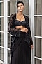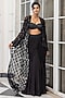 Featuring a black jacket in satin base with cutwork embroidery. It is paired with a bralette and a skirt. Accentuate it with zircon or swarovski jewellery and embellished heels for sangeet or cocktail ceremony.